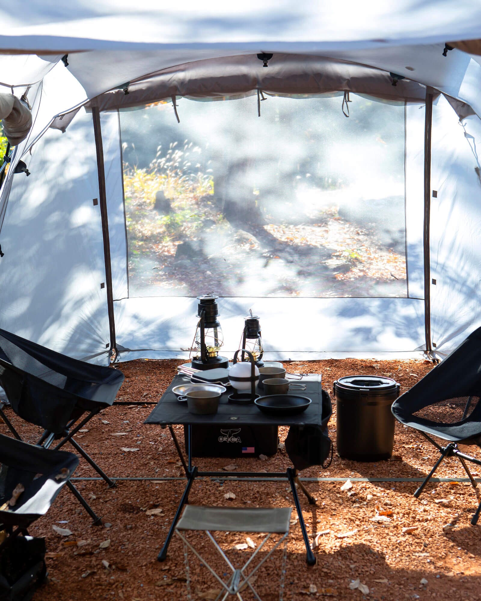 [展示サンプル]「ZIZ(ジズ)」はファミリーやグループユースに適した快適な空間を提供する2ルームテントです。広大なリビングダイニングスペースを備え、巨大なシェルターとしての使用も可能。ムラコのラインナップで最大サイズのテントです。インナーテントには最大で5名収容可能です。ルーフトップカバーが付属しています。