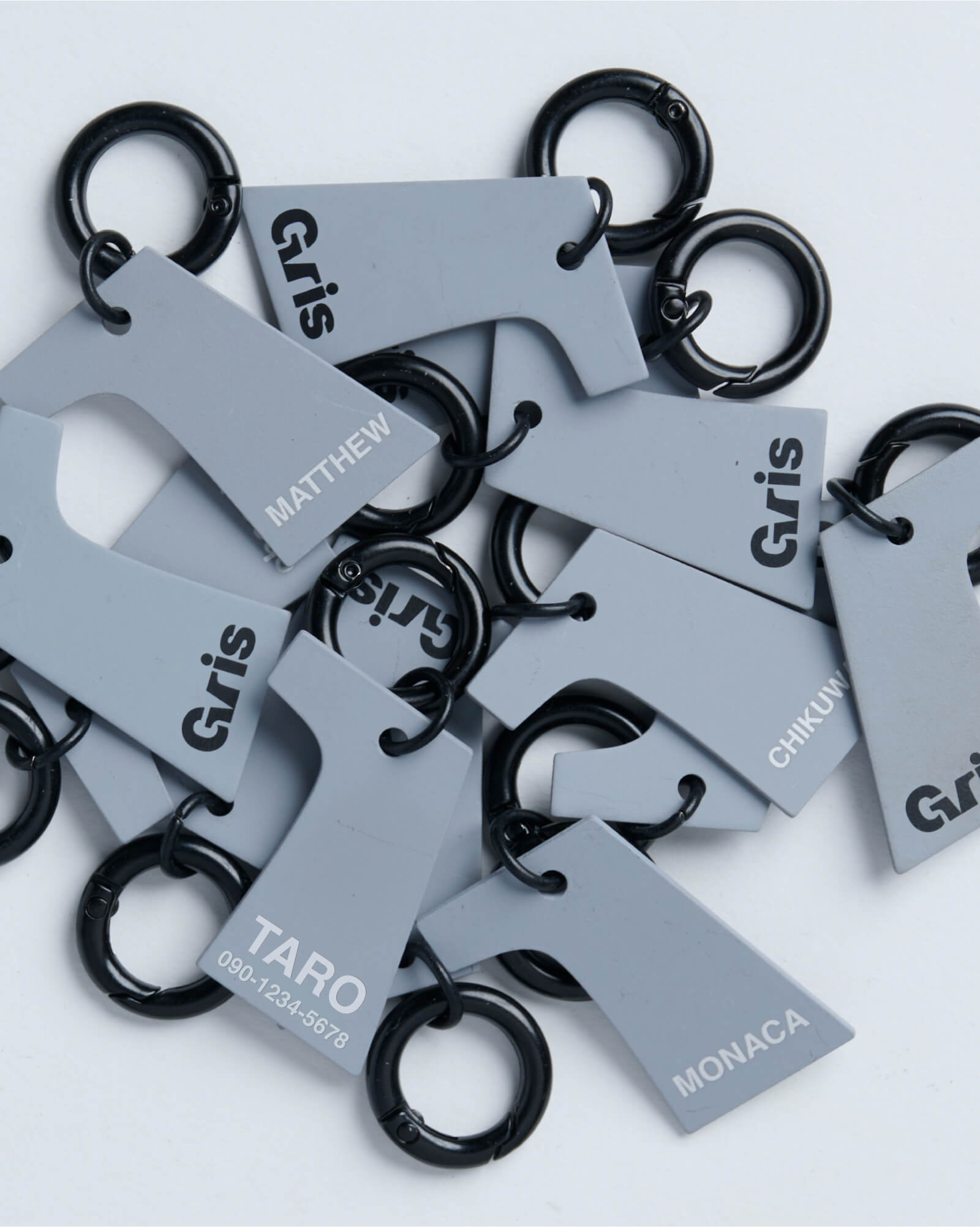Grisのチャームにレーザー刻印で名入れをするサービスです。愛犬の名前や連絡先の電話番号、記念日を刻印することができます。