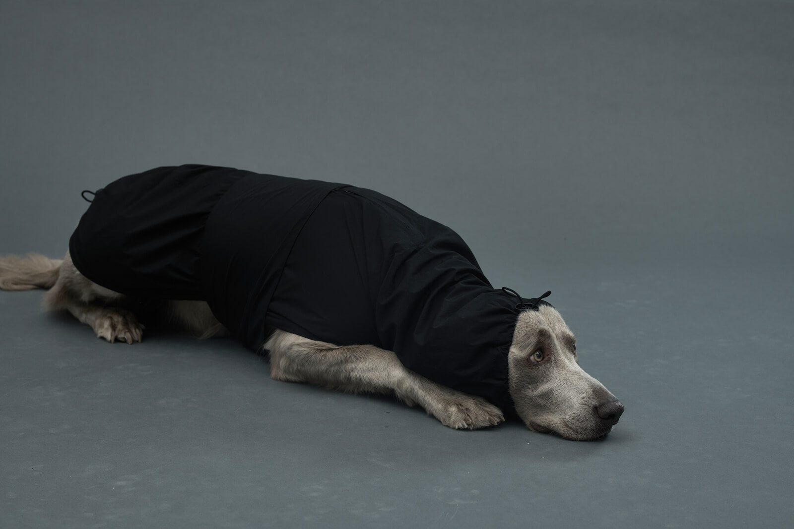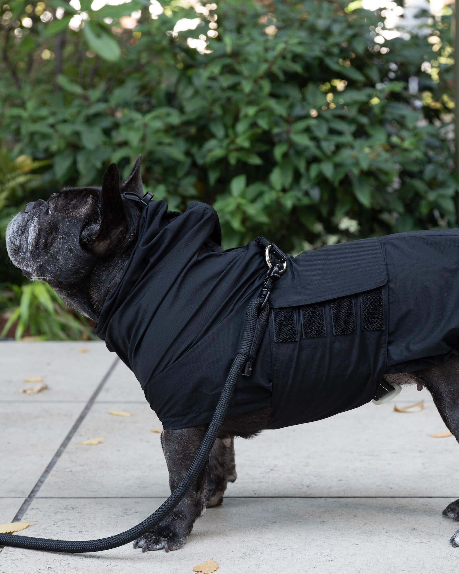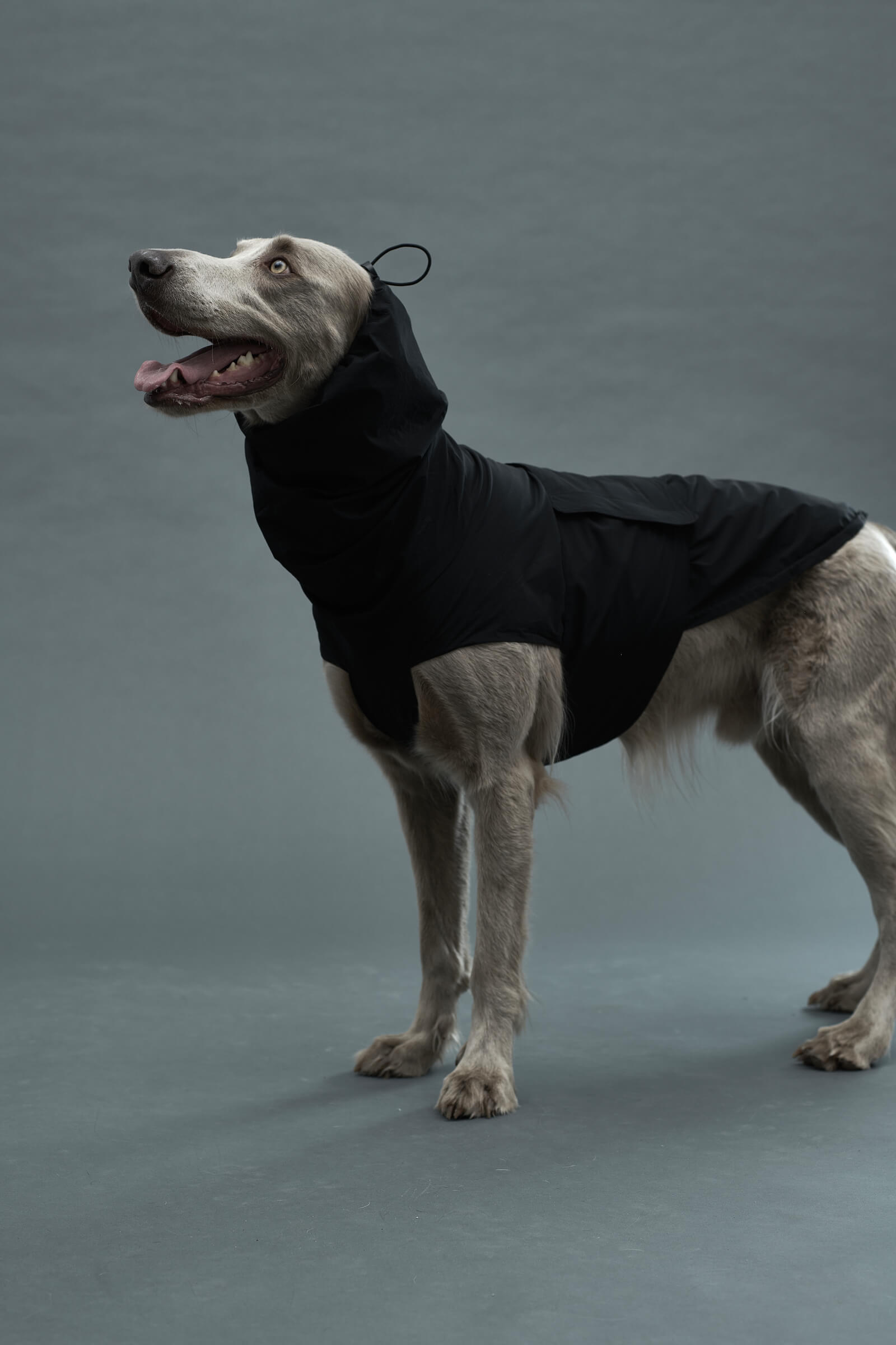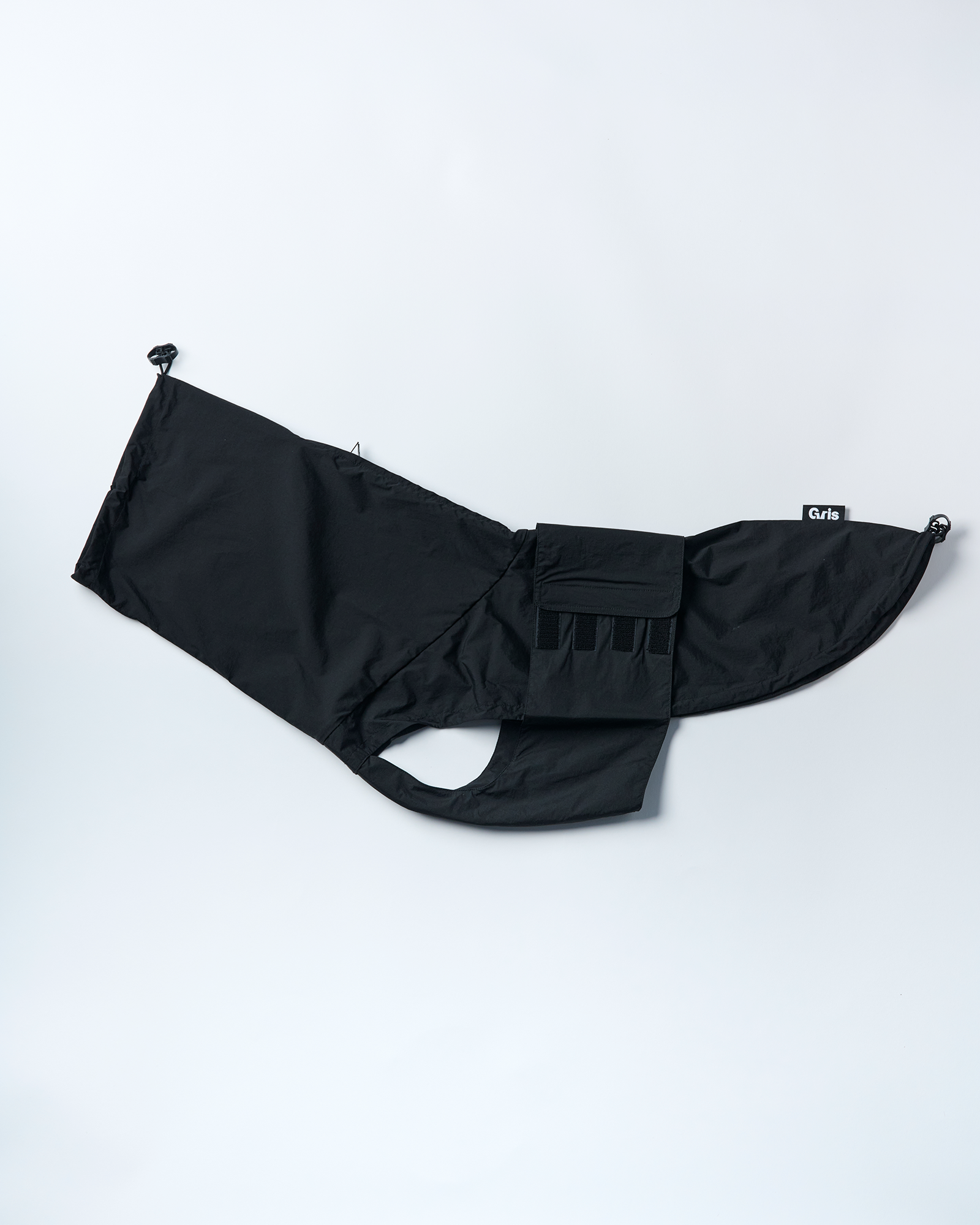 軽量で伸縮性のあるレインコートです。ハーネスの上からでもリーシュを繋げるように改良しました。非常に軽く撥水性のある生地をベースに、首だけでなく耳までカバーすることができます。お腹から巻くウエストストラップにより着脱が容易なだけでなく、愛犬にしっかりとフィットさせることができます。襟と裾にはドローコードを配し簡単にフィット調整ができます。雨の日さえも楽しみになる1着です。
