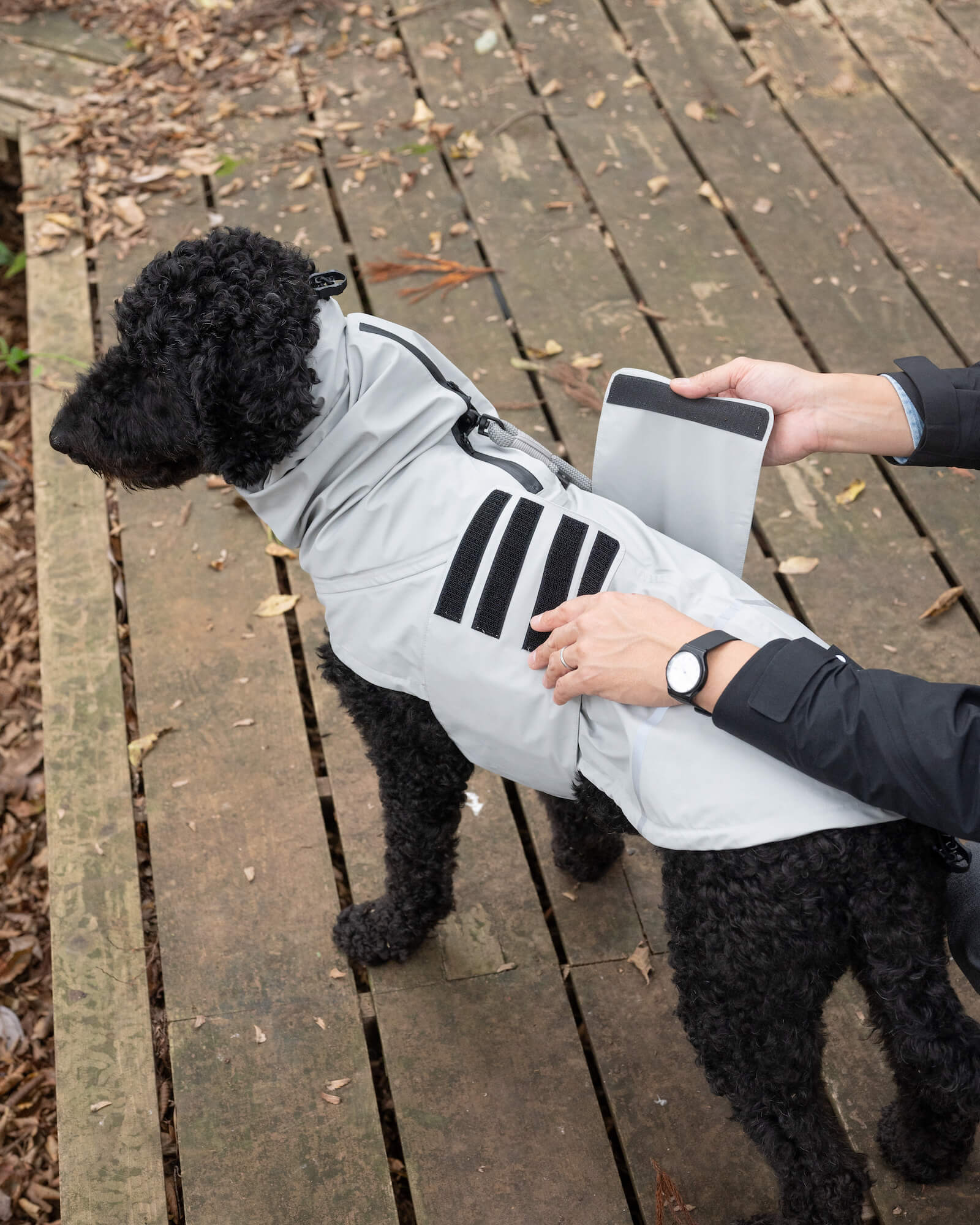 防水生地を使用した犬用レインジャケットです。ウィンドブレーカーとしても機能し、愛犬だけでなくお散歩後のお家も濡らしません。 ウエストバンドが最適なフィット感をもたらし、犬の自然な動きを妨げません。フードにはジッパーにハーネスホールが付いているので、ハーネスを装着した犬にも最適です。小型犬から大型犬まで使えるサイズラインナップを揃えています。