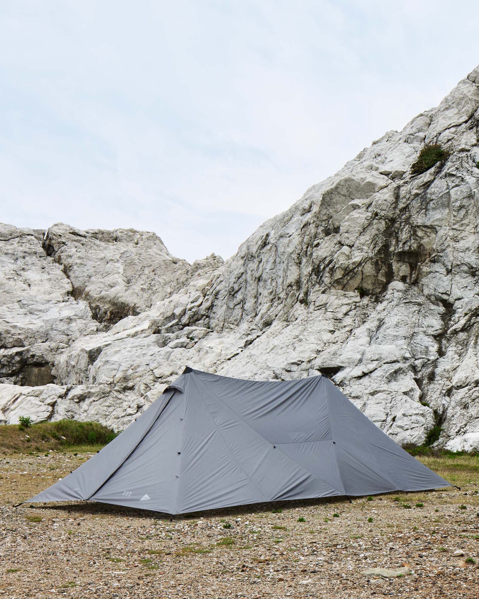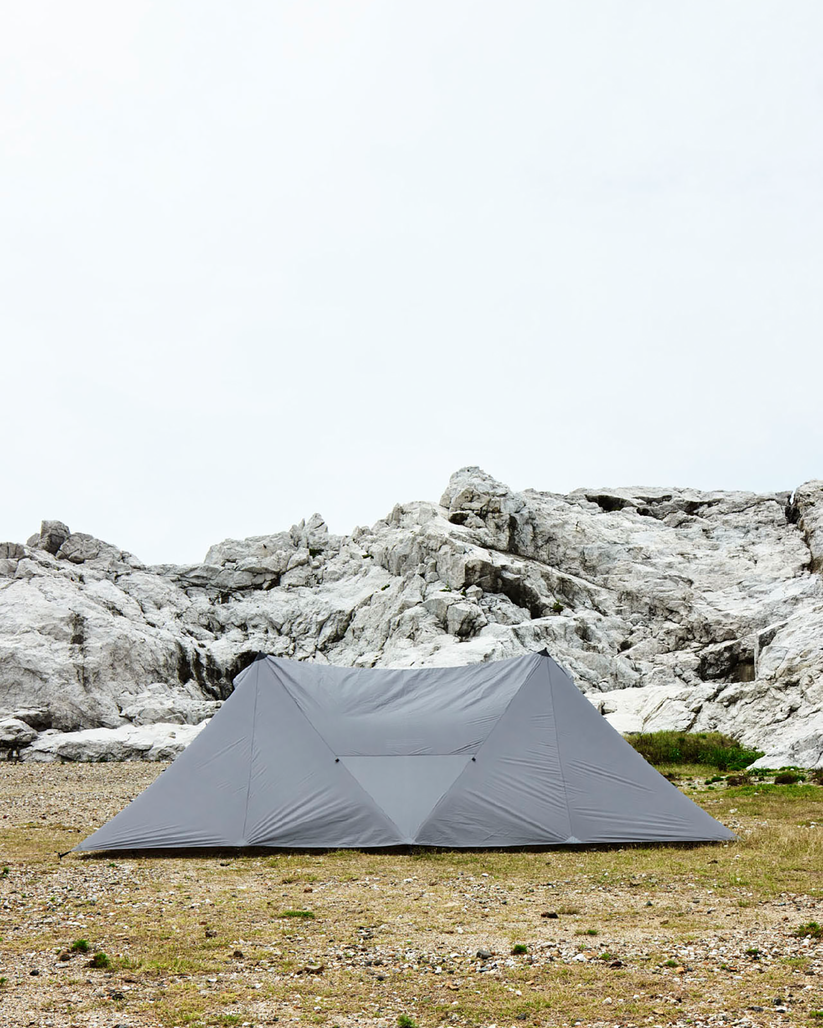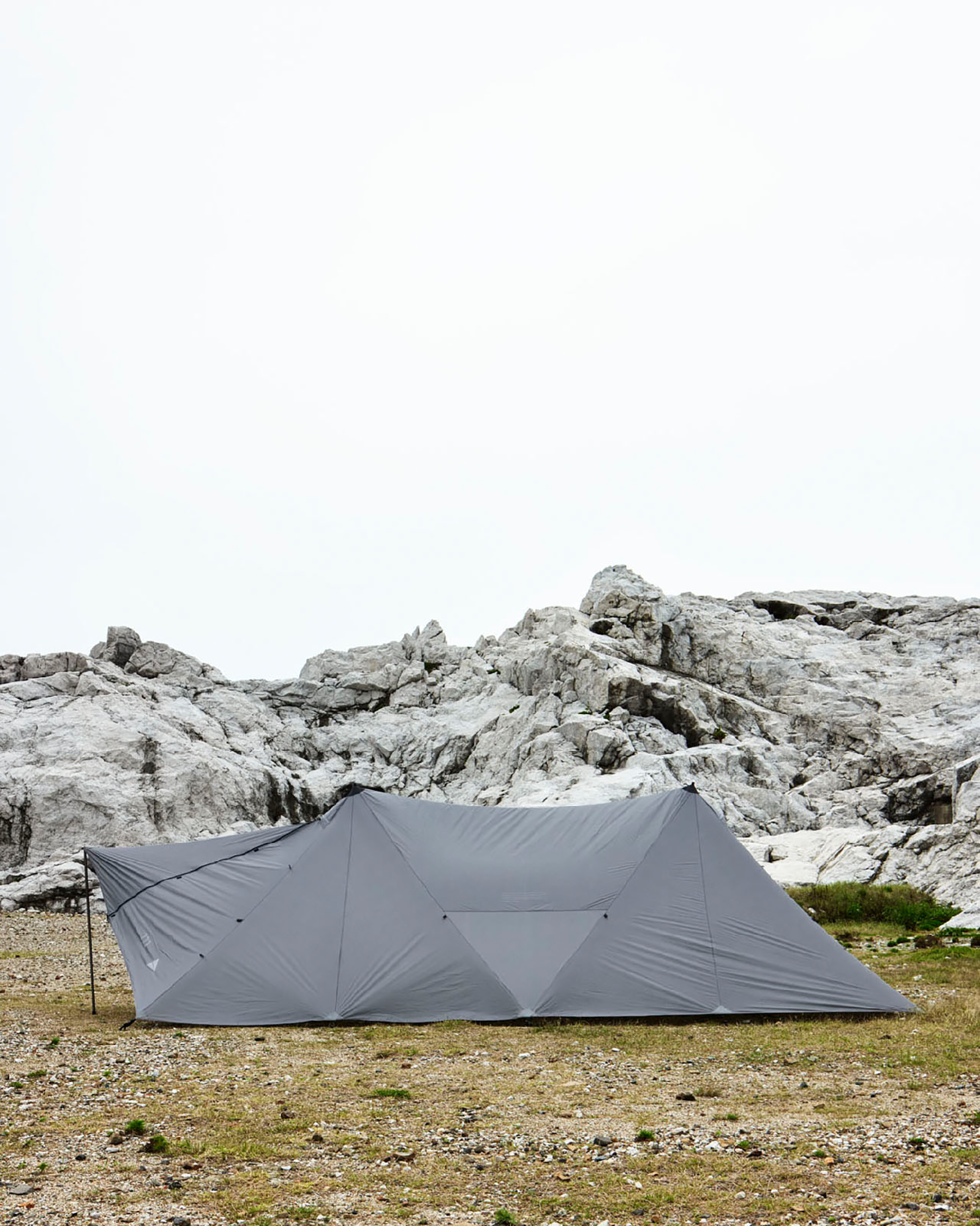 シンプルな構造なので、短い時間、少ない労力で設営が行えます。まずフライシートを地面に広げ、4隅をペグで固定します。その後センターポールを頂点部に立てるだけ。自立式のドーム型テントでは得られない圧倒的な設営のシンプルさと、頭上のクリアランスが魅力です。