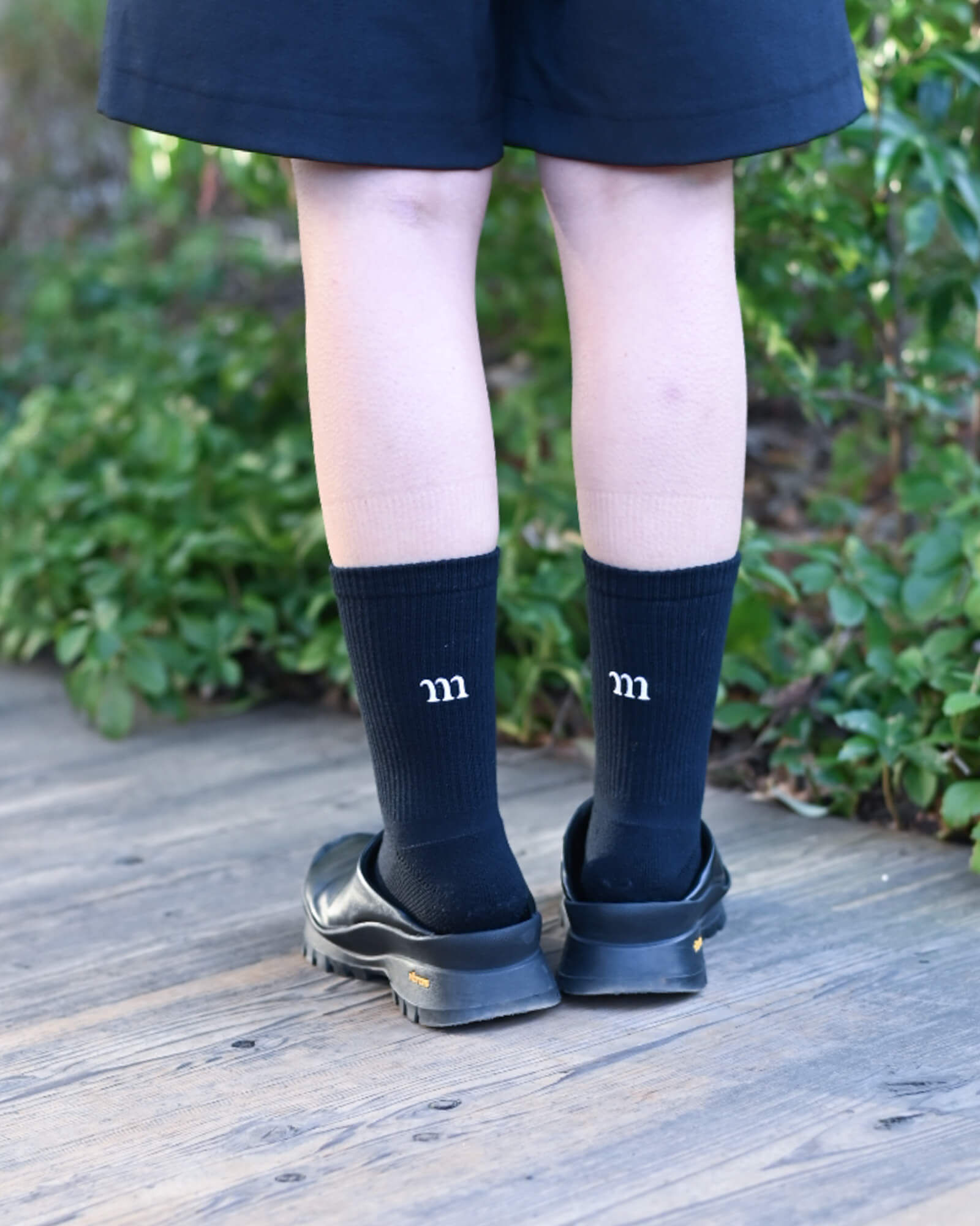 レッグウェアブランドのMARCOMONDEとコラボレーションした、スポーティーで履き心地の良いパイルソックスです。背面にはmロゴの刺繍を施し、足裏にはmuracoとMARCOMONDEの文字をレイアウトしています。足裏はクッション性と吸水性のあるパイル編みで、足首はしっかりとホールドする肉厚のリブになっています。アクティブなシーンに広く使えるソックスです。