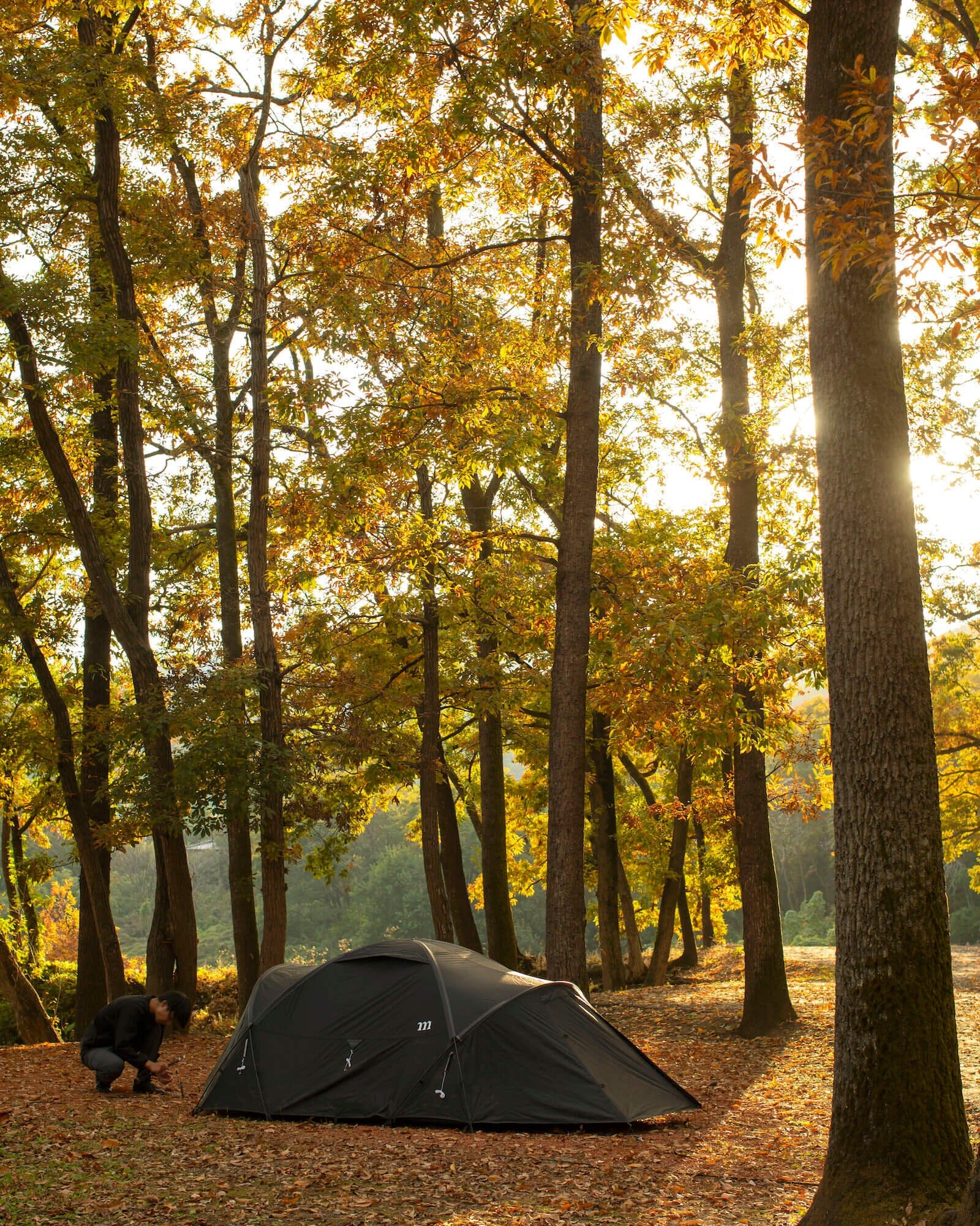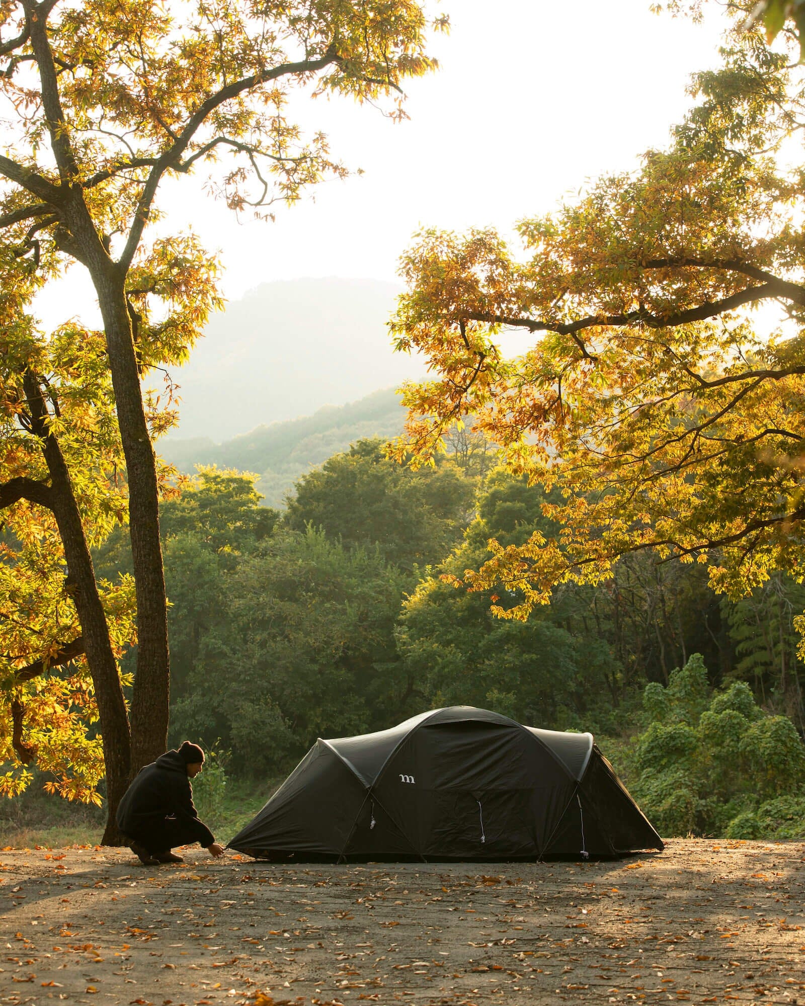 テントの構造で最も安定感があるドーム構造を採用しています。テントはポールが交差する箇所が多ければ多いほど構造が安定します。NORMのポールのクロスポイントは5カ所。風や雨から室内空間を守ると共に、広い室内空間を確保しています。