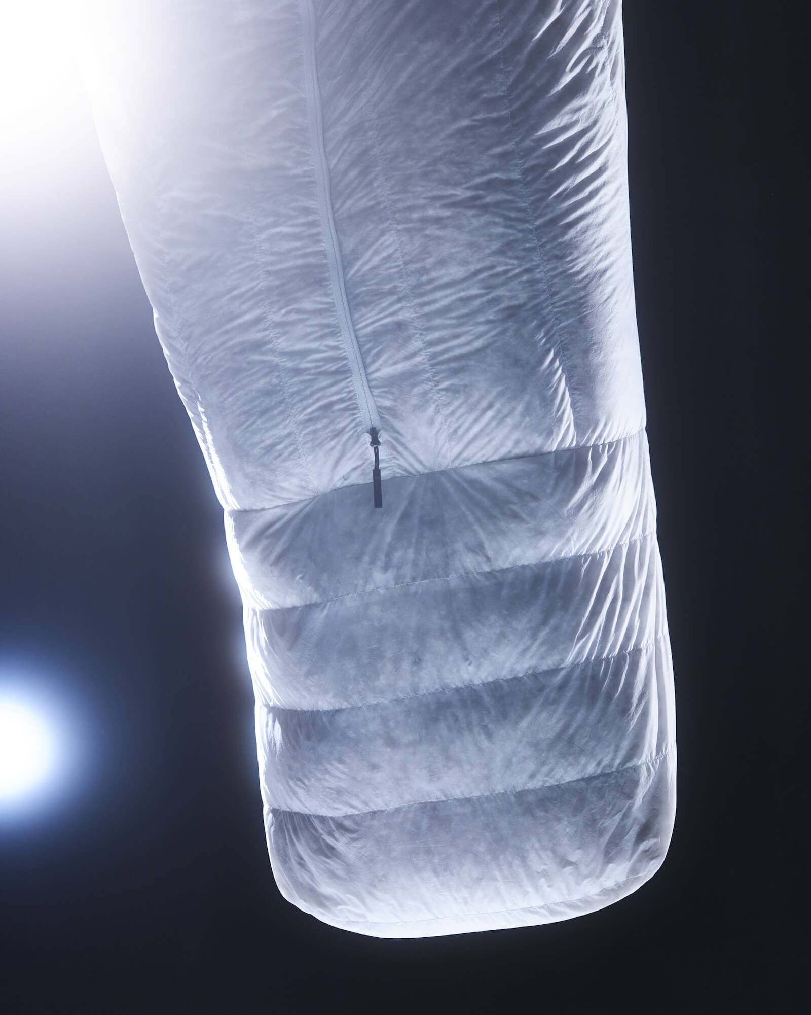 立体的なボックスキルト構造でダウンの片寄れを抑制し、上部には縦方向のキルトパターンを採用することで体温を効率良く足先まで循環させます。