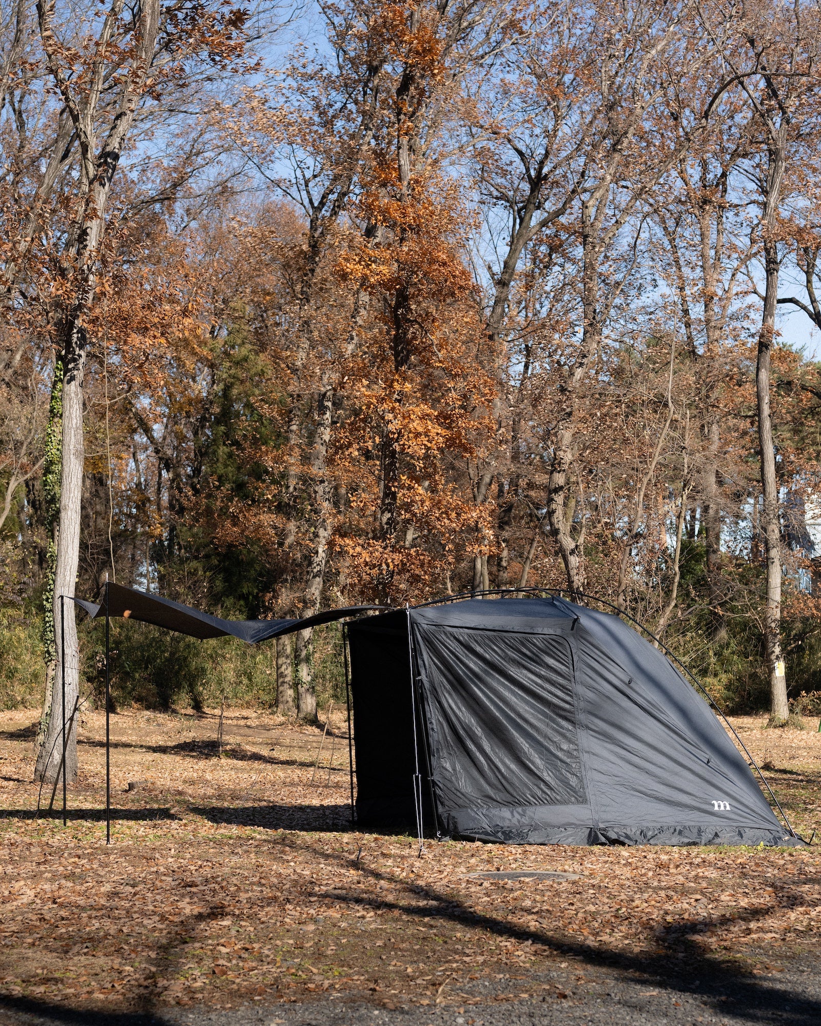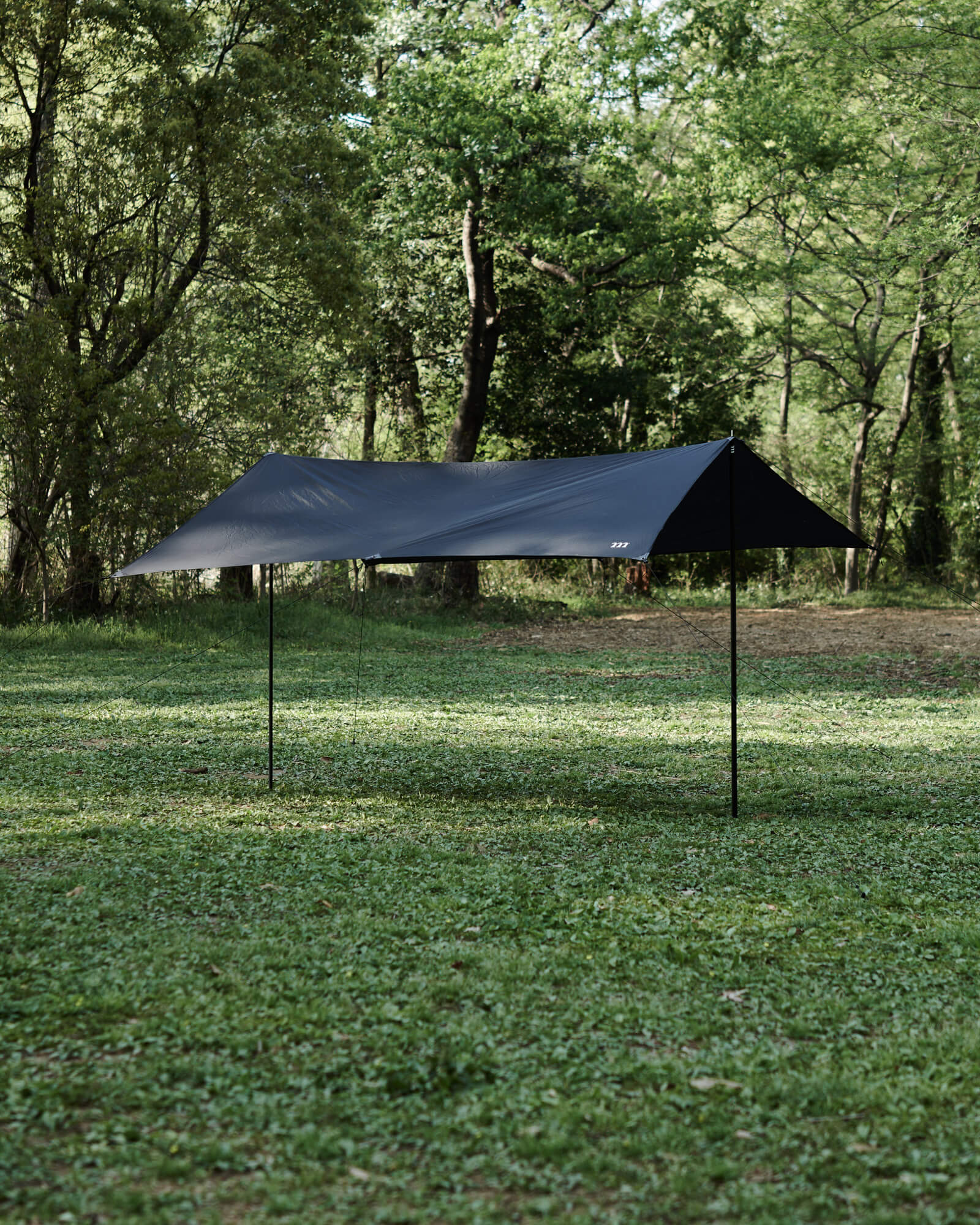 15Dのリップストップナイロンで仕立てた軽量タープ。muraco最小の1~2名に適したサイズのタープでソロキャンプにもおすすめです。単体での使用はもちろん、山岳テントのRAPIDE X1と組み合わせで使用する事も可能なサイズとしています。両サイドにカーブがあることで、影の面積、設営性の向上を目指しています。また、ロープはテントとの接続時に素早いセッティングが可能な設計としています。