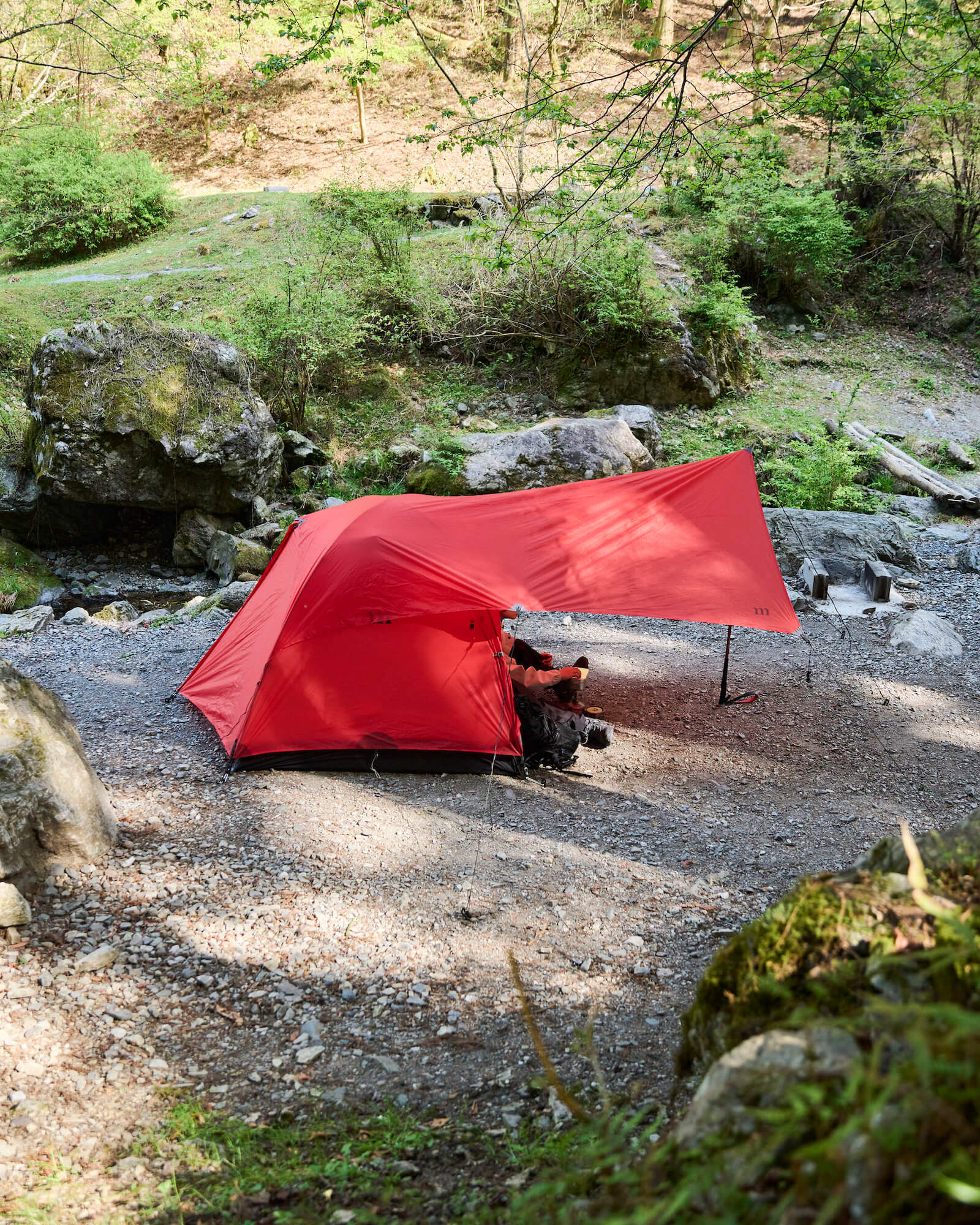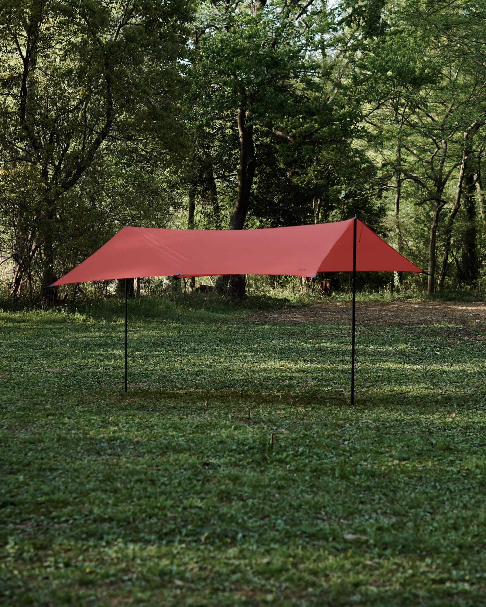 15Dのリップストップナイロンで仕立てた軽量タープ。muraco最小の1~2名に適したサイズのタープでソロキャンプにもおすすめです。単体での使用はもちろん、山岳テントのRAPIDE X1と組み合わせで使用する事も可能なサイズとしています。両サイドにカーブがあることで、影の面積、設営性の向上を目指しています。また、ロープはテントとの接続時に素早いセッティングが可能な設計としています。