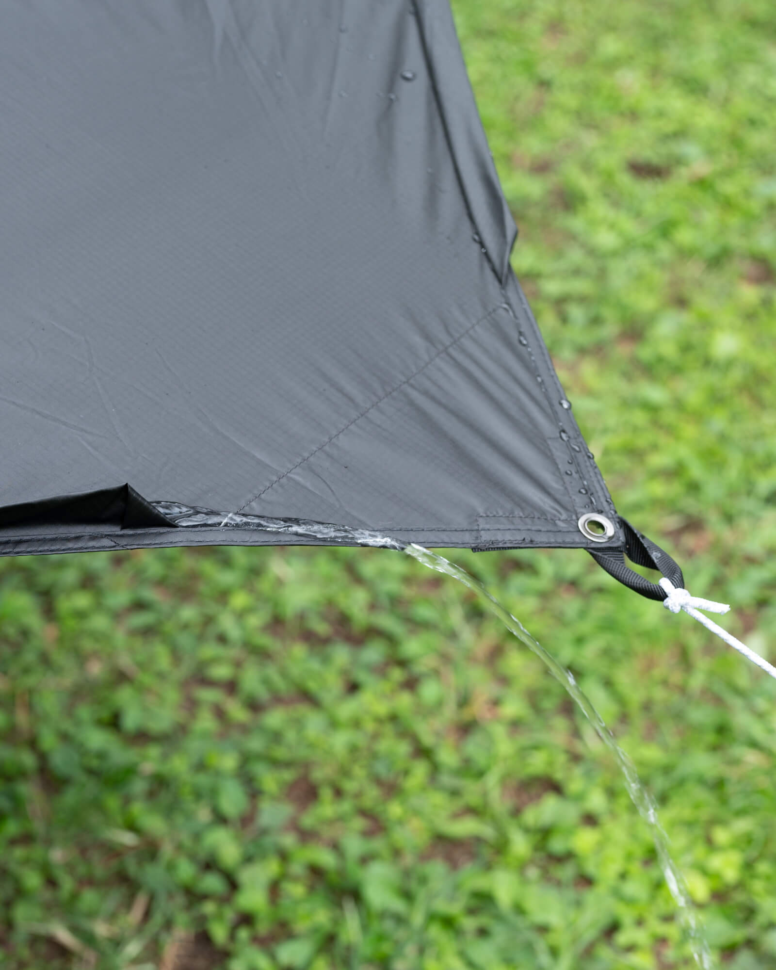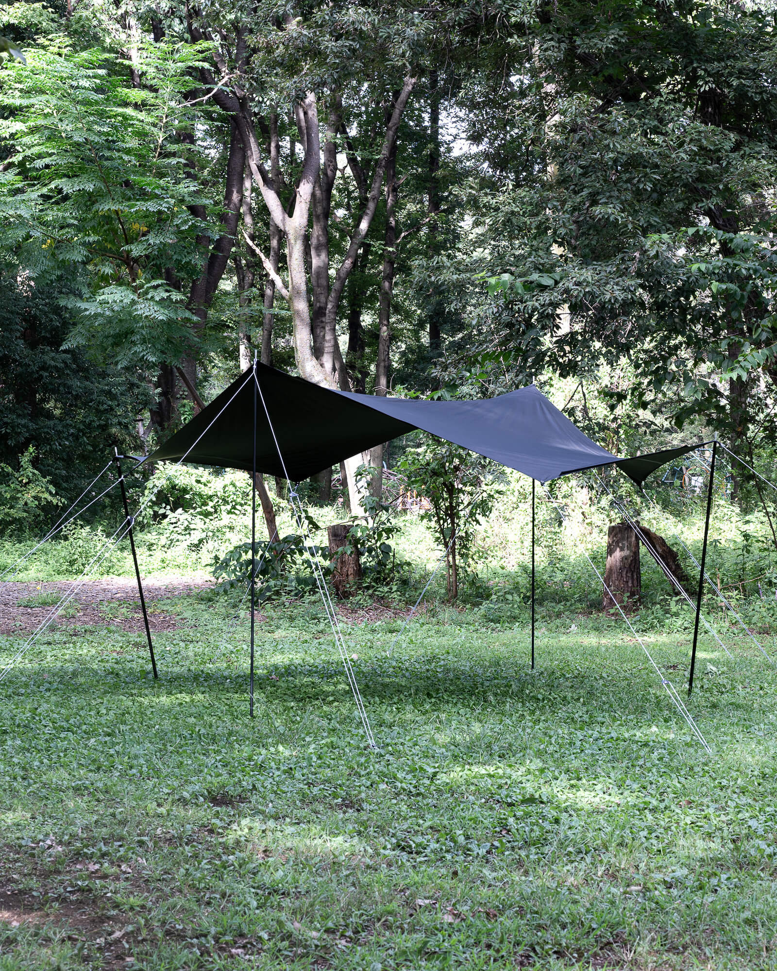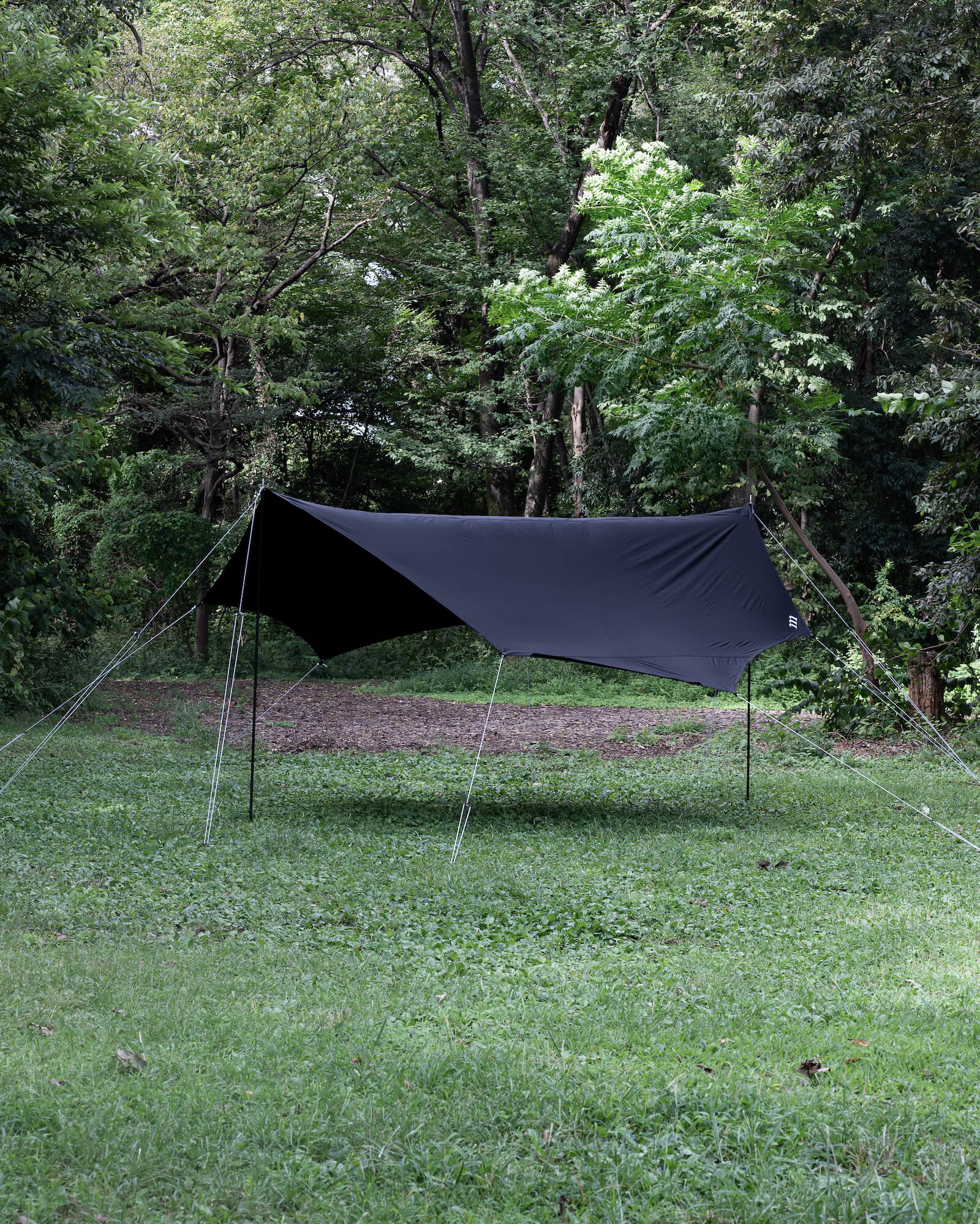 遮光性と排水性に優れたアシンメトリー形状のタープです。生地の裏面にブラックカラーのPUコーティングを施すことで光の透過を極限まで抑え、濃い影を作り出します。フチには雨どいが付いているので、コーナー部分から雨をスムーズに排出できます。左右非対称の形状により、テントに連結させた設営に適しています。様々な気候・地形でテントと組み合わせて最適な形状を作り出すことができます。2〜4人に適したサイズです。