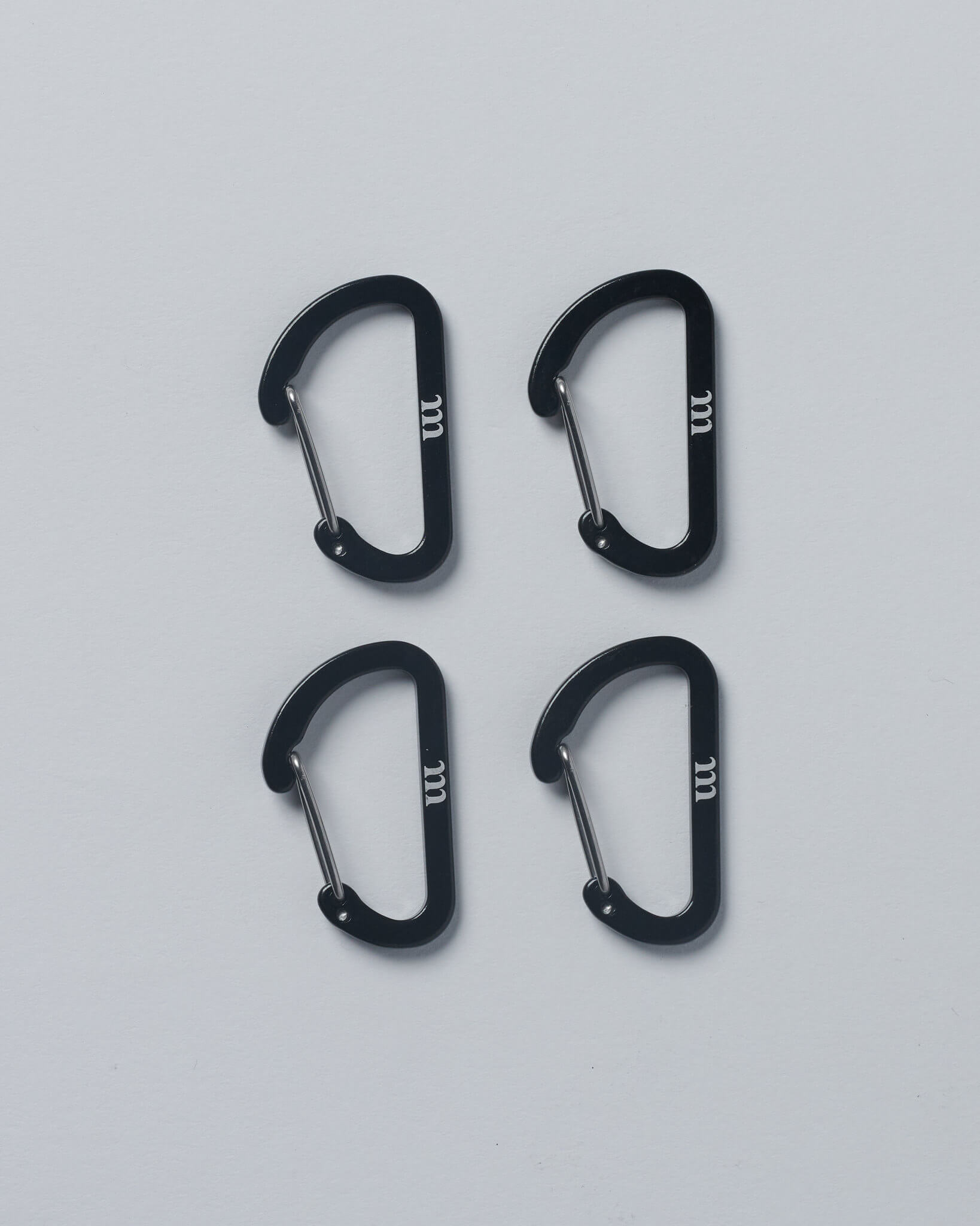 mロゴがレーザーマーキングされたブラックカラーのカラビナです。ワイヤーゲート式なのでワンアクションで引っ掛けられます。小物を掛けるなど汎用的に使えます。40mmサイズの4個セットです。