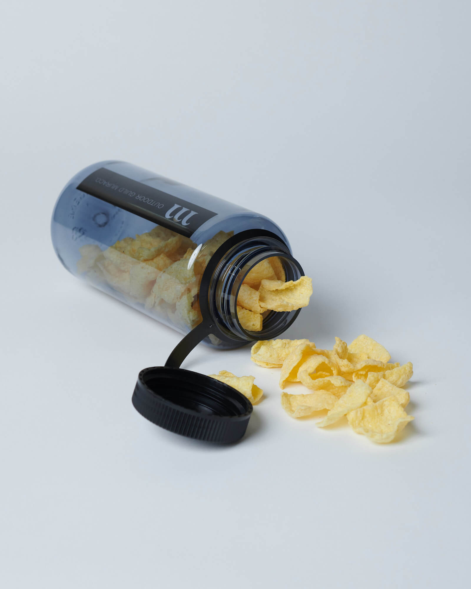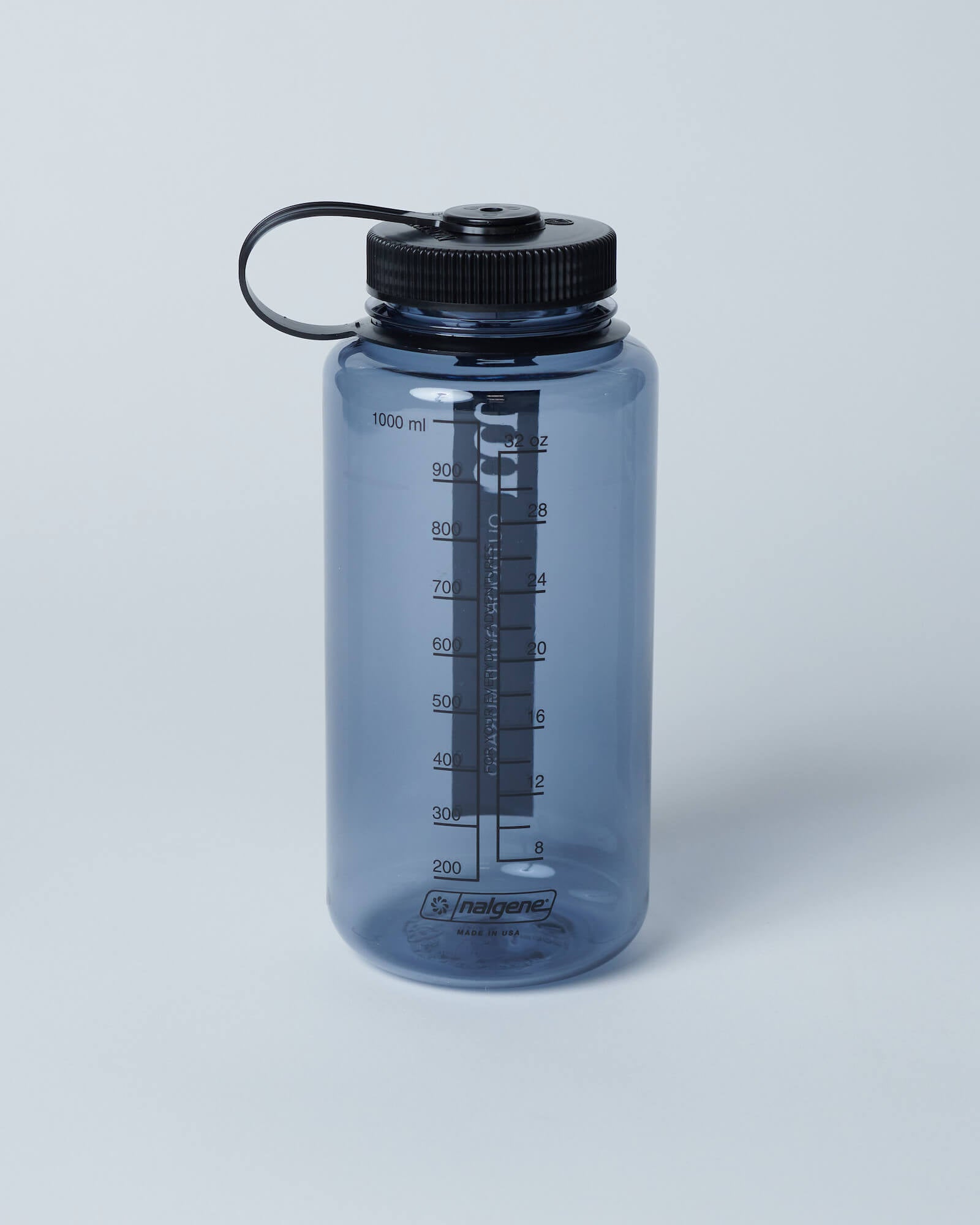 ナルゲンの広口1.0L グレーのムラコ別注モデル。ボトル側面にmロゴを配しました。 キャップはループ付きになっていて、落として紛失しないのもうれしいポイント。飲料はもちろん、お菓子や行動食を入れて使うこともできます。 材質は透明性、強度、耐熱性に優れたEastman社のTritan™(トライタン樹脂)を使用しています。パッキンがない構造でありながらも高い密閉性を誇り、洗いやすく衛生的です。