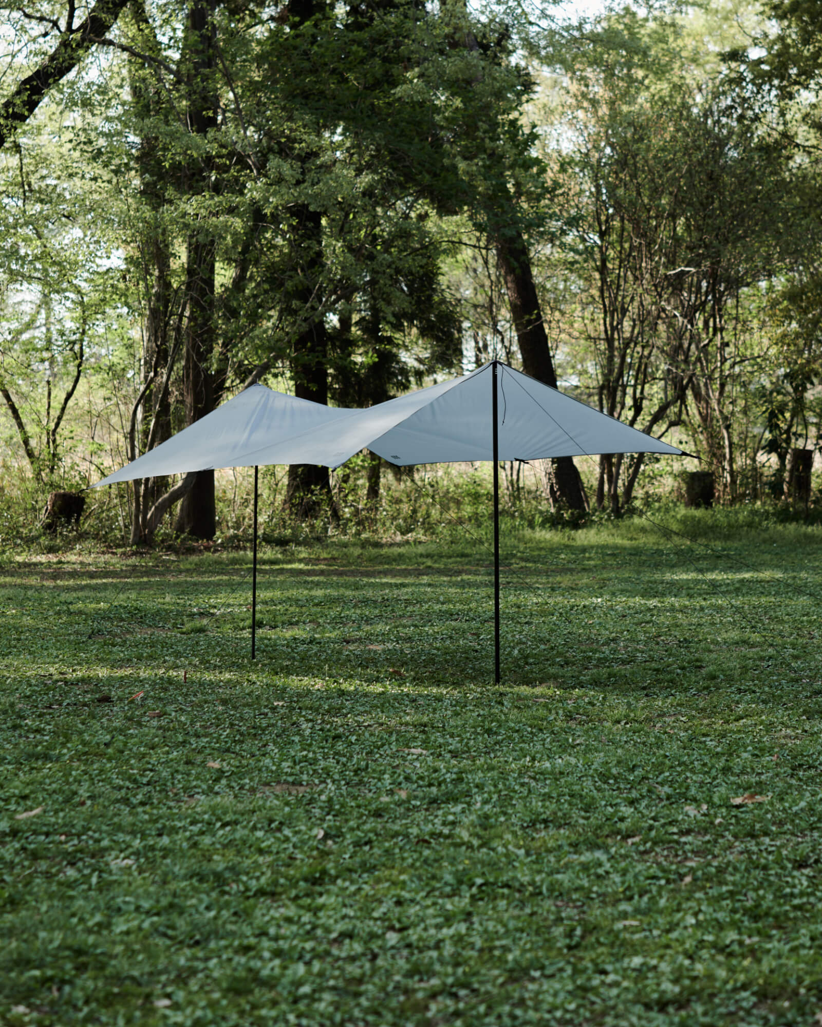 15Dのリップストップナイロンで仕立てた軽量タープ。muraco最小の1~2名に適したサイズのタープでソロキャンプにもおすすめです。単体での使用はもちろん、山岳テントのRAPIDE X1と組み合わせで使用する事も可能なサイズとしています。両サイドにカーブがあることで、影の面積、設営性の向上を目指しています。また、ロープはテントとの接続時に素早いセッティングが可能な設計としています。