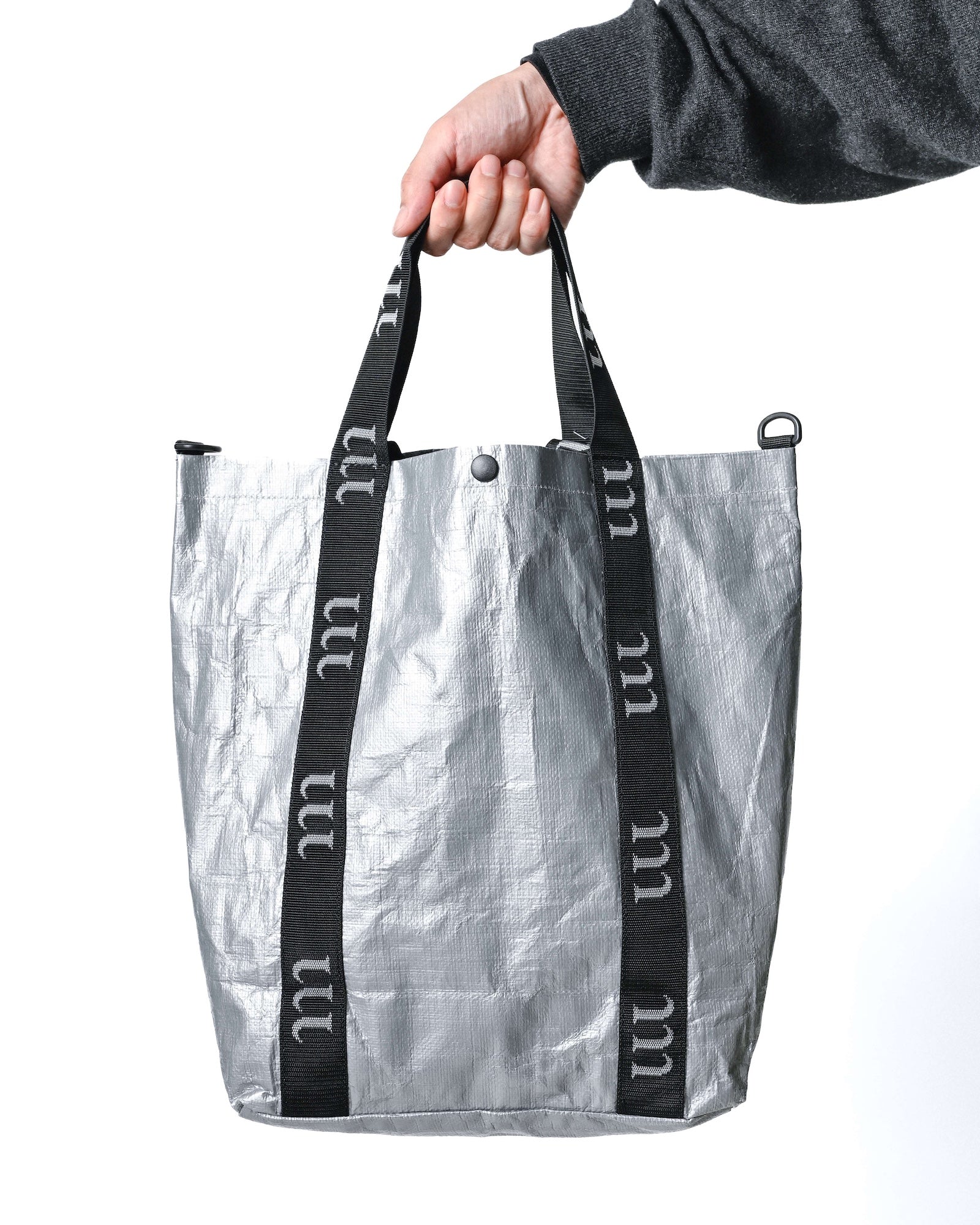 レジャーシートなどに使われる丈夫な防水生地で作った万能トートバッグです。日常でもキャンプでも使えるようサイズにこだわりました。Mサイズは、A4サイズや15インチのノートPCがちょうど入るようになっていて、普段使いのバッグとして使いやすいサイズです。長短2種類のハンドルを付けたことで、手持ちでも肩掛けでも使用できます。